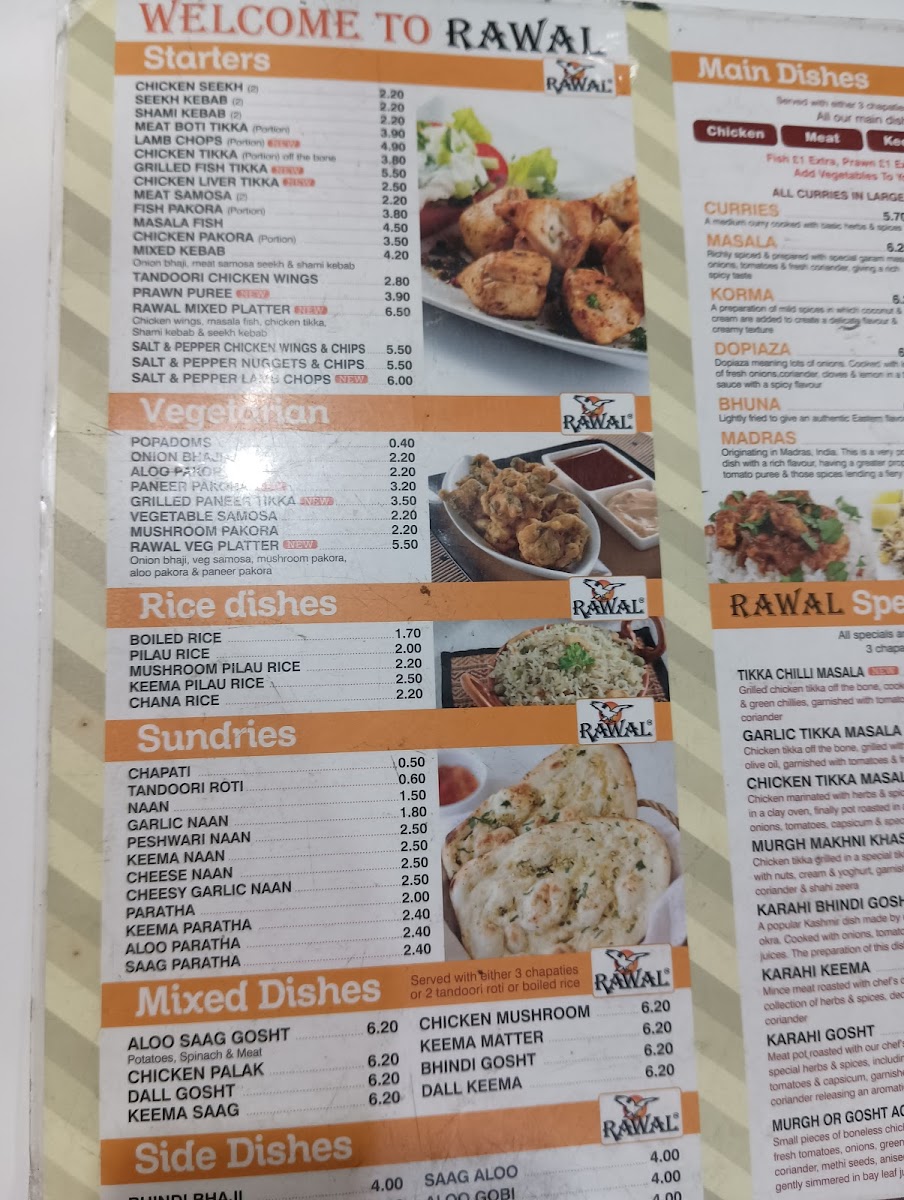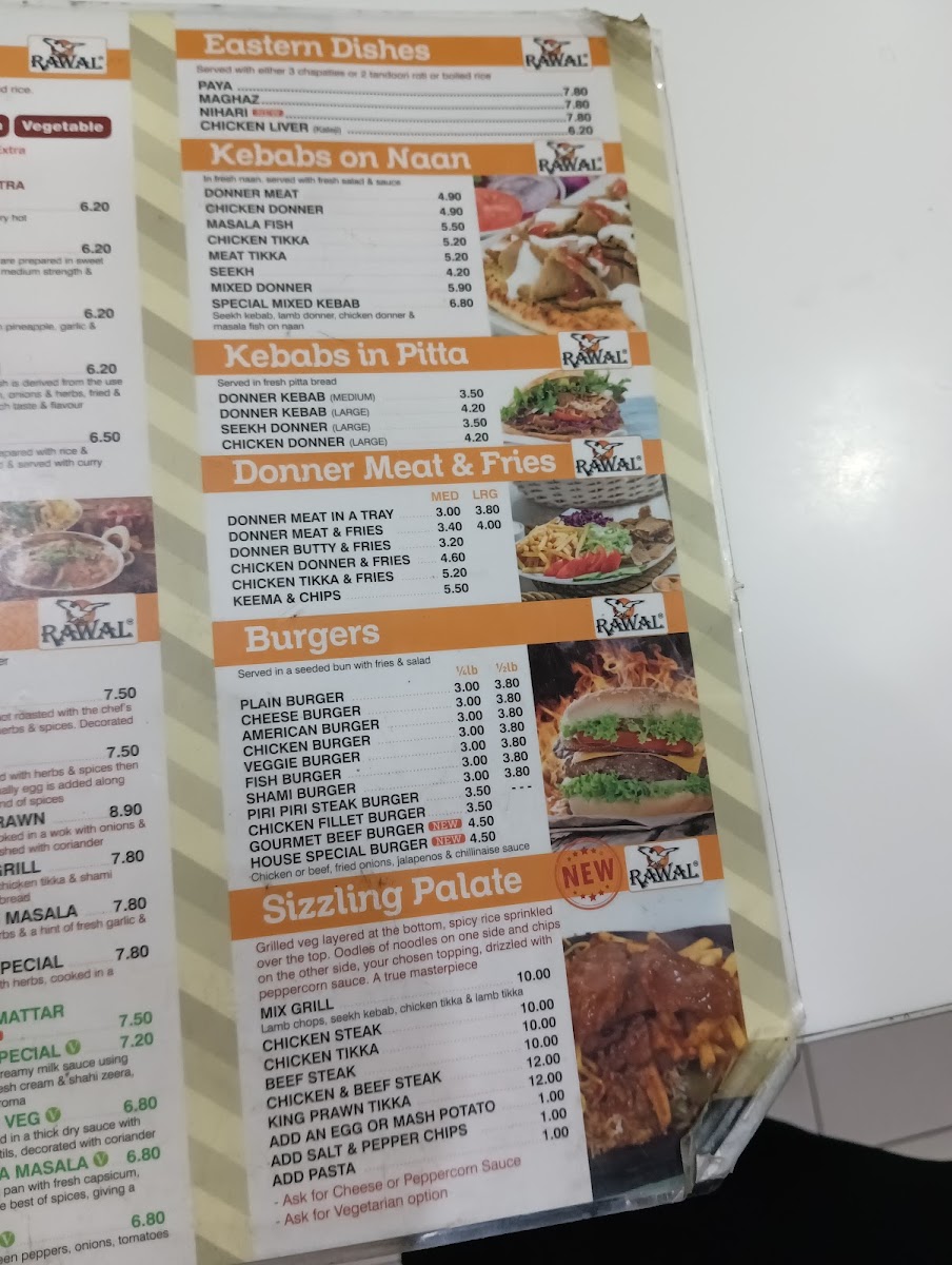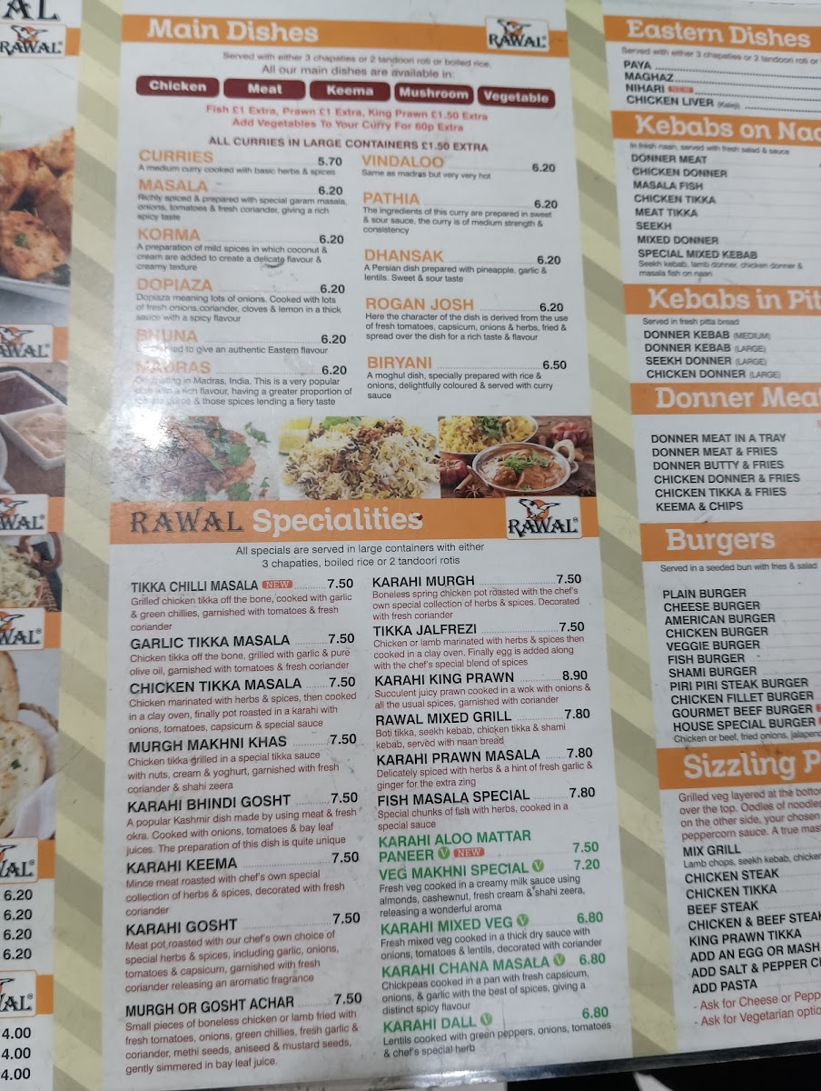 The menu at Rawal Kebab House offers a diverse selection of flavorful dishes that cater to various tastes. For starters, you can indulge in options like Chicken Seekh or Seekh Kebab and try the delicious Shami Kebab or Meat Boti Tikka. If you're in the mood for something heartier, the Lamb Chops are a standout. The rice dishes are equally tempting, with choices such as Boiled Rice, Pilau Rice, and Mushroom Pilau Rice, as well as flavorful options like Keema Pilau Rice and Chana Rice. For a complete meal, their Mixed Dishes range from the aromatic Aloo Saag Gosht to the creamy Chicken Palak and Dall Gosht. The Rawal Spe menu offers special delights like Tikka Chilli Masala, Garlic Tikka Masala, and the rich Murgh Makhni Khas, which are perfect for spice lovers. Traditional favorites like Korma, Dopiaza, and Vindaloo Curries also make an appearance under their main dishes. For something even more indulgent, the Rawal Mixed Grill and Karahi King Prawn are sure to satisfy any craving. If you prefer Eastern specialties, dishes like Paya, Maghaz, and Nihari Z bring authentic flavors to the table. A wide variety of kebabs are offered, including Donner Meat, Chicken Donner, and Masala Fish. There are also convenient options like Donner Meat & Fries or Chicken Tikka & Fries. For a more casual bite, the burgers, such as the Cheese Burger and Chicken Burger, are popular choices. If you're in the mood for sizzling platters, try the Mix Grill or a perfectly cooked Chicken Steak. Finally, to round off your meal, don't forget to enjoy side options like Popadoms, Onion Bhaj, or a Rawal Veg Platter. With such an extensive menu, Rawal Kebab House offers something for everyone.